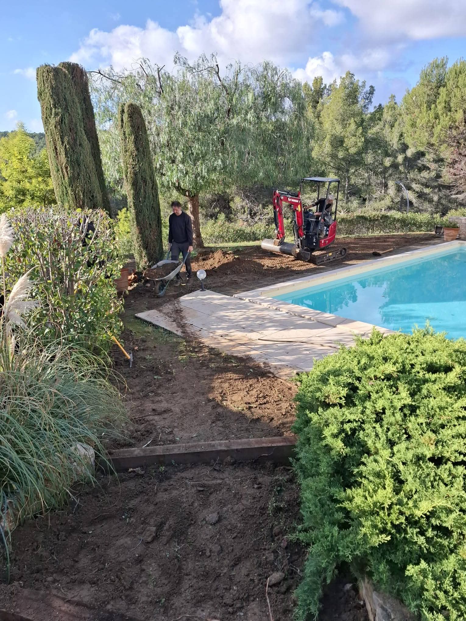 L’objectif principal : simplifier l’entretien du jardin, limiter l’arrosage et créer un accès supplémentaire vers la piscine, tout en conservant un cadre naturel et harmonieux.